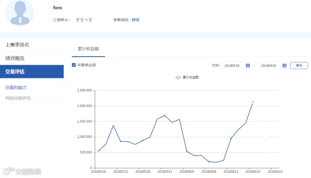 樊先生是本次好汉组中“唐宝财富”和“fans”账户的实际操作者,他在第八届笑傲江湖实盘大赛好汉组获得第7名,一直以来他所秉持的交易信条是:从供需面研究商品行情末来可能的发展方问,耐心等待技术上给出的确认信号,中线持有。相信短线的回调是为了更大的飞跃。在6月18日之前以一波连续盈利,排在排行榜的前列,虽然目前成绩有所下滑,但毕竟比赛还在进行,整理好思绪,继续上路,期待樊先生有更好的成绩。