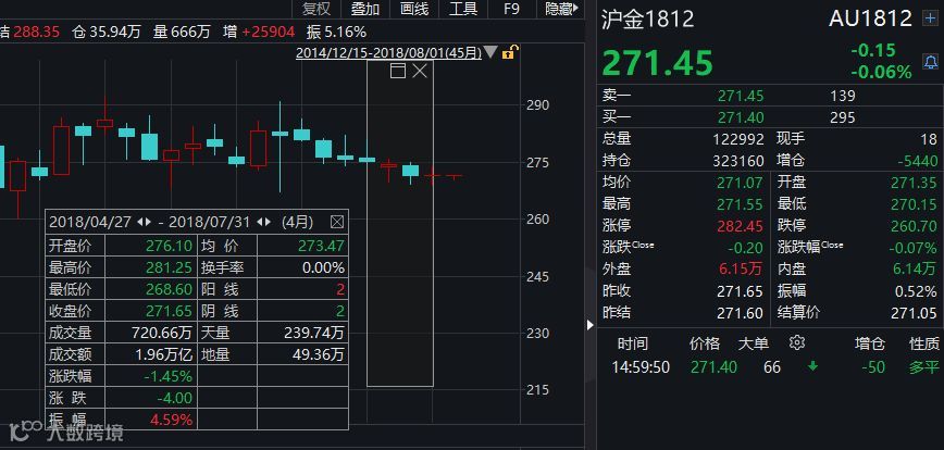 整体来说,国内金价相比国际金价走势更为平稳。4月以来沪金主力1812合约仅跌1.45%,跑赢COMEX黄金5.8个百分点,最新收报271.45元/克。