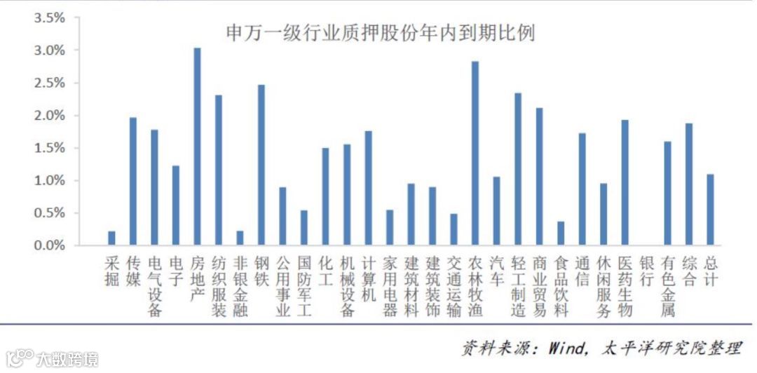 分行业看,6月仅有农林牧渔行业个股的质押市值比例超过0.1%,年内质押市值占总体比例超过1.5%的仅有传媒、电气设备、房地产、纺织服装、钢铁、化工、机械、计算机、农林牧渔、轻工制造、商业贸易、通信、有色金属以及综合行业,且仅有纺织服装行业及钢铁行业两个小市值行业(分别占全A整体市值的0.982%及1.435%)在11月质押股份到期比例超过1%,并不能构成系统性风险。