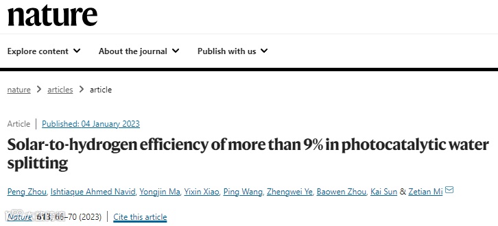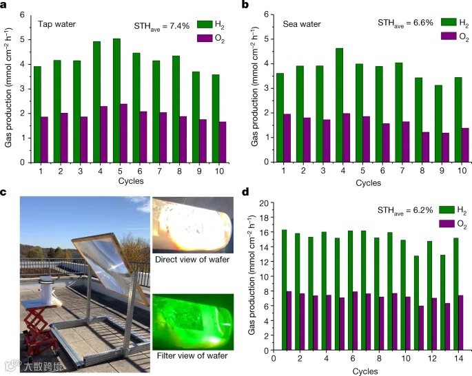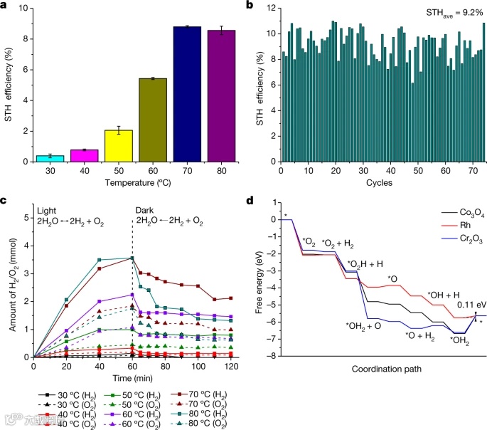 研究人员利用纯水、集中的太阳光和氮化镓铟光催化剂实现了9.2%的高STH效率。本文策略的成功源于促进正向氢氧演化和抑制反向氢氧重组的协同效应,通过在最佳反应温度(约70摄氏度)下操作,可以直接通过收集太阳光中先前浪费的红外光来实现。此外,这种随温度变化的策略也导致从广泛获得的自来水和海水中获得约7%的STH效率,以及在自然太阳能光容量为25 7W的大型光催化水分离系统中获得6.2%的STH效率。该研究提供了一种利用天然太阳光和水有效生产氢燃料的实用方法,克服了太阳能制氢的效率瓶颈。