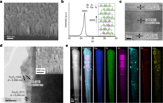 研究人员通过分子束外延生长技术在商业硅片上制备了具有高结晶度和宽可见光响应范围(<632nm)的InGaN/GaN纳米线光催化剂。InGaN/GaN纳米线在硅晶片上排列良好,具有高结晶度,长度约为1.2μm(图1a, b)。此外,观察到厚度约为10nm的GaN作为覆盖层来支撑InGaN,表明InGaN/GaN纳米线的原子构型可控(图1c)。其中,Rh/Cr2O3核/壳和Co3O4纳米粒子在InGaN/GaN纳米线上被光还原,并分别充当氢和氧生产的助催化剂(图1d, e)。由于成分拉动效应,InGaN/GaN纳米线中In的分布随生长方向而变化,导致能带隙发生较大变化,从而导致宽带光吸收。