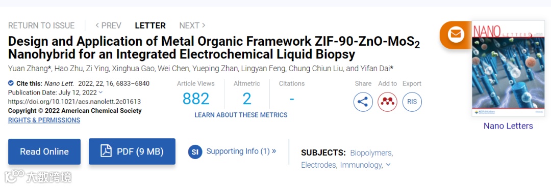 为了实现对多个待测标志物的联合检测,上海大学的张源团队开发了一种多通道的传感芯片检测平台。利用3D打印技术(NanoArch S140,摩方精密)辅助制作了PDMS的微流控通道,并在微通道内部集成了电化学传感检测电极,用于对外泌体表面多个标志蛋白进行同时检测。所设计的微流控通道不但方便开展各种多通道和系列化操作与实验,更适于在复杂环境中对痕量待测物进行检测研究。论文相关工作以“Design and Application of Metal Organic Framework ZIF-90-ZnO-MoS2 Nanohybrid for an Integrated Electrochemical Liquid Biopsy”为题被国际著名期刊《Nano Letters》接收发表,并被选为封面论文。