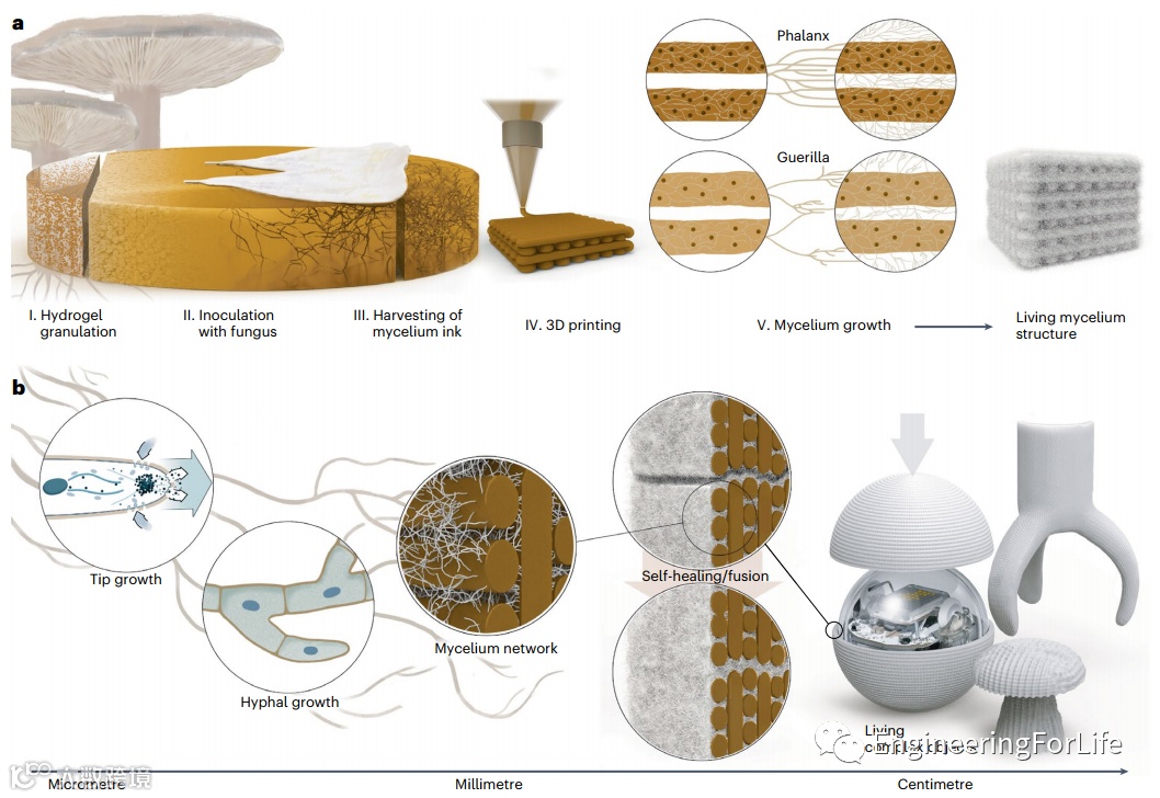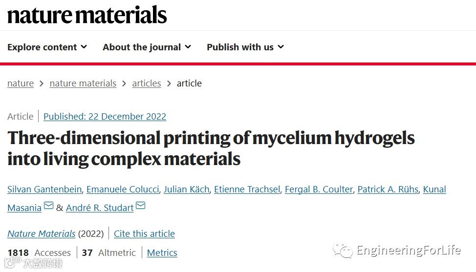 细菌、真菌等微生物在现实生活中无处不在,近年来,这些微生物的一些独特生物过程逐渐被深入开发利用,甚至作为组分合成了一系列具有独特功能的生物基合成材料,为这些合成材料的在更广泛领域内的应用增添了新的希望。近日,受真菌菌丝体的启发,来自瑞士苏黎世联邦理工的André R. Studart教授等人创造性地设计了一种利用真菌菌丝的新兴特性整合3D打印技术来制造具有“生命”的复杂材料的方法,该策略制备的活体材料可实现自我修复,再生和环境适应,同时充分发挥材料的功能服务于特定的工程目的。该材料的制作主要是将装载真菌的水凝胶利用3D打印技术打印成晶格结构,从而促进菌丝在水凝胶里的定位植入,并实现间隙之间的桥连,研究还基于该方法制造了一种具有“生命力”的仿生皮肤材料,该材料展现出坚固的机械性能,同时可以实现自我清洁、以及损伤后自动适应和再生。相关研究内容Three-dimensional printing of mycelium hydrogels into living complex materials”为题,于2022年12月22日发表于国际顶级期刊《Nature Materials》,并进行Research Briefing专栏报道