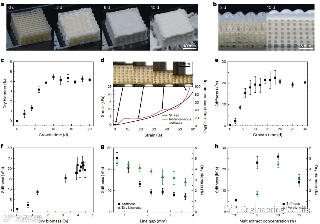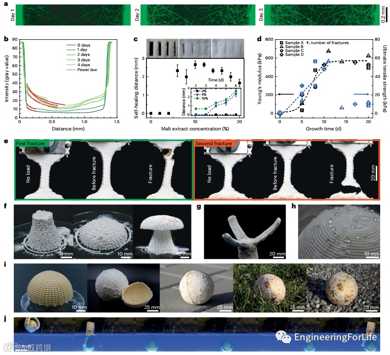 传统的合成材料都会随着时间的推移而退化,在没有人为干预的情况下无法进行自适应或愈合。此外,制造这些材料通常需要高温和苛刻的条件,而相比之下,由生物有机体制成的生物材料,如木材和骨骼,都可以实现生长、自我再生并自主适应环境的特性,从而更全面地发挥其生物功能,此外,这些生物材料通常可以在温和的温度下由生物体的生物机械驱动的水生产。工程生物材料领域近年来也一直都在研究利用微生物生物学为材料带来生命,并取得了相应的一些研究进展,但现在亟需解决的一个关键内容是,如何探索在自然界中为特定任务进化的真菌生物机制与工程应用中功能和几何约束的相互协调和辅助