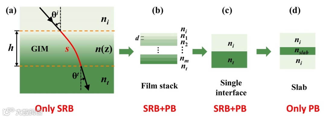上文我们已经揭示一般界面的PSHE由SRB和PB相位共同主导。能否通过设计合适的界面来调节这两部分的权重?首先考虑一个极端的情况,即两个半无限大的介质由一个匀变的梯度折射率材料(GIM)连接过渡 (图3a)。理想情况下,如果GIM的折射率变化非常平滑(即厚度h→∞),则光束可以无反射地通过GIM,并且tp = ts = 1。此时透射光束中只有正常模式,没有异常模式。这意味着GIM的PSHE完全由SRB相位主导。GIM产生的光束位移(图1d)与折射率从ni到nt突变的单界面的正常模式的位移相同。当GIM厚度减小时(即折射率变化率增大),由于界面阻抗失配而发生反射,且tp不再等于ts,使携带PB相位的异常模式出现。此时,PSHE由SRB相位和PB相位共同主导(图3b和3c)。很显然,当入射介质与透射介质折射率相等时(图3d),透射光束相对于入射光来讲,传输方向没有发生偏折,此时正常模式虽然还在,但它携带的SRB相位为0,此时的PSHE完全由PB相位主导。