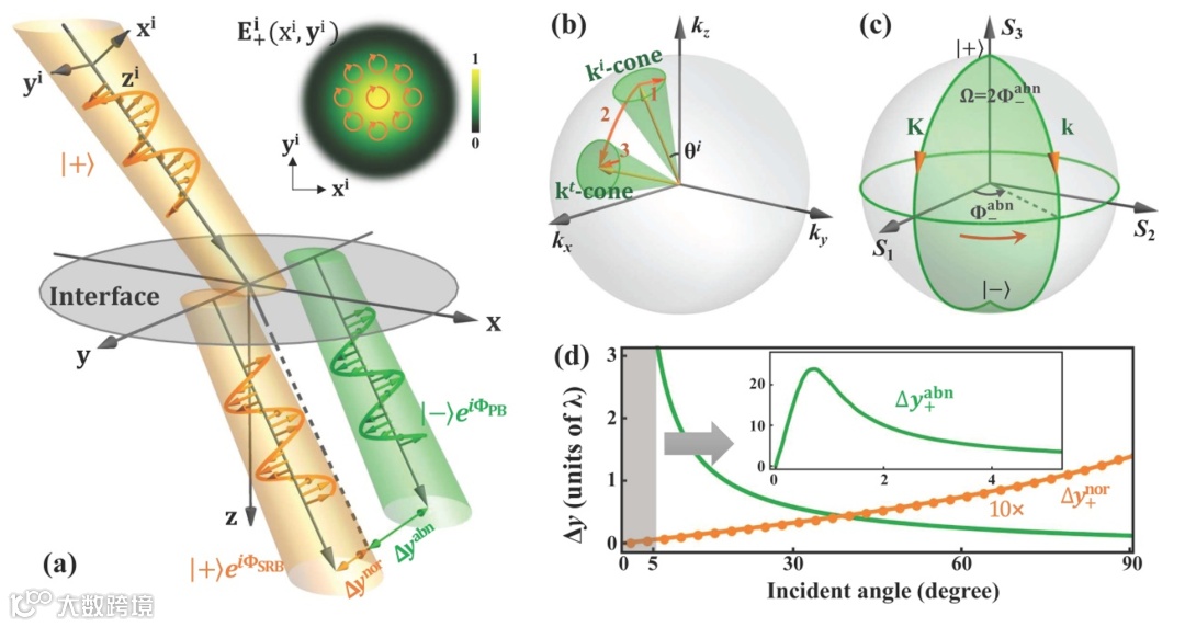 图1光束在突变界面折射时的两种Berry相位及其导致的PSHE。(a):圆偏振光束在突变界面折射时的示意图。折射光束分成两部分,一个自旋不变的正常分量,携带SRB相位(ΦSRB),横向位移为Δynor;另一个自旋反转的异常分量,携带PB相位(ΦPB),表现为Δyabn的位移。(b)和(c):分别用k方向球和Poincaré球来表示SRB相位和PB相位(图中K和k分别指光的中心和任意非中心平面波的波矢)。(d):计算由折射率ni= 1和nt= 2构成的单界面中的正常模式(橙线)和异常模式(绿线)的光束位移。