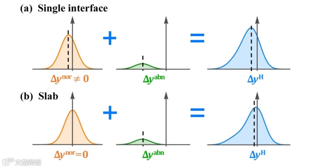 携带SRB相位的正常模式具有微小的偏移但相对较大的权重,而携带PB相位的异常模式具有较大的偏移但较小的权重。后者在PSHE中起着重要作用,这一点以前很少被注意到。如果考虑线偏振入射的情况,折射光束包含四个模式,其中两个为左旋圆偏振光束,分别携带SRB相位和PB相位,另外两个为右旋圆偏振光束,分别携带共轭的SRB相位和PB相位。以前的文献在计算PSHE时,大多考虑线偏振入射,直接利用角谱理论和Fresnel公式,计算上也能得到正确的结果,但却无法讨论PSHE的真正物理机制。实际上,线偏振光束入射下的PSHE可以看成是具有相对较大权重和微小位移的正常模式与具有较小权重和较大位移的异常模式的相干叠加(如图2)。