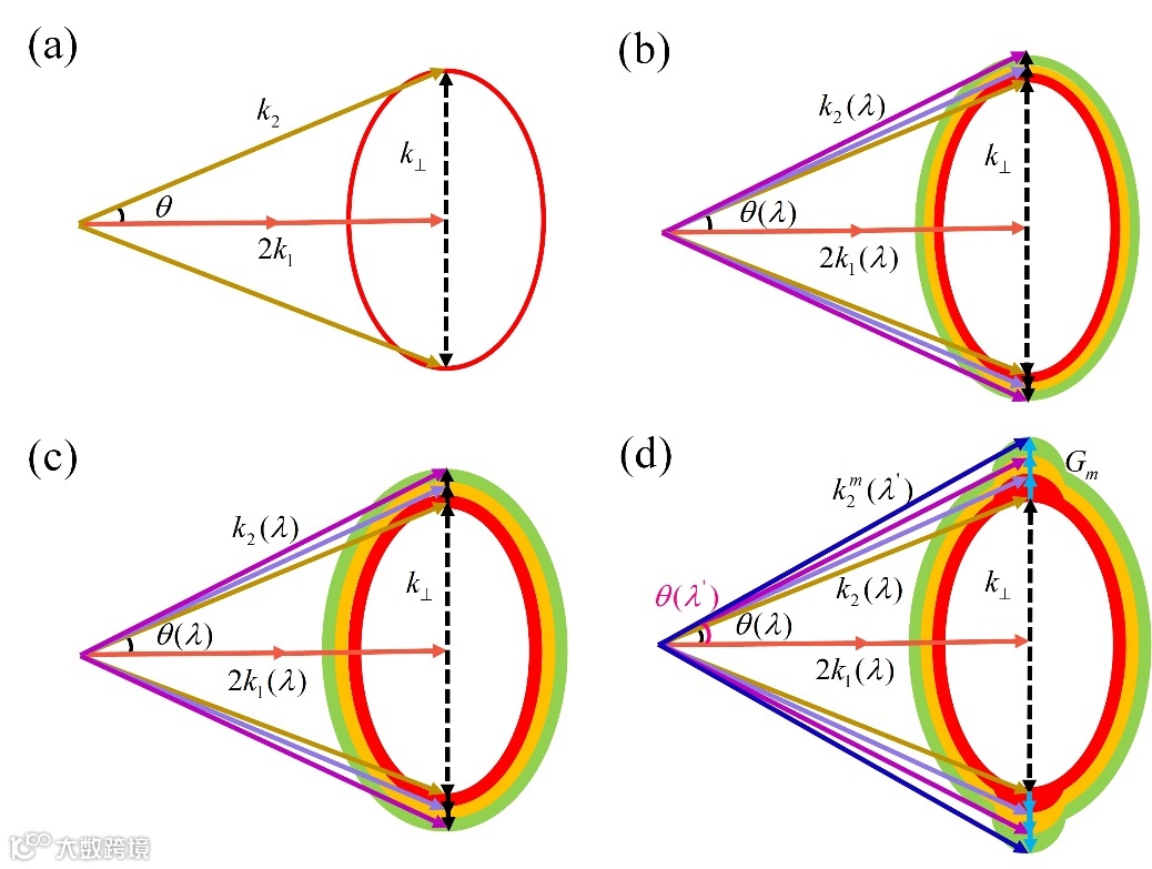 图2. PPLN非线性晶体中产生超宽带彩虹切伦科夫辐射的相位匹配原理图。(a) 单色泵浦光通过二阶非线性效应产生单色切伦科夫二次谐波的相位匹配图。(b) 超短泵浦激光脉冲通过二阶非线性效应产生宽带彩虹切伦科夫二次谐波的相位匹配图。(c) 高峰值功率飞秒泵浦激光通过二阶和三阶非线性协同作用产生宽带彩虹切伦科夫二次谐波的相位匹配图。(d) 通过二阶和三阶非线性协同作用结合PPLN非线性晶体的倒格矢带作用产生加宽的宽带彩虹切伦科夫二次谐波的相位匹配图。