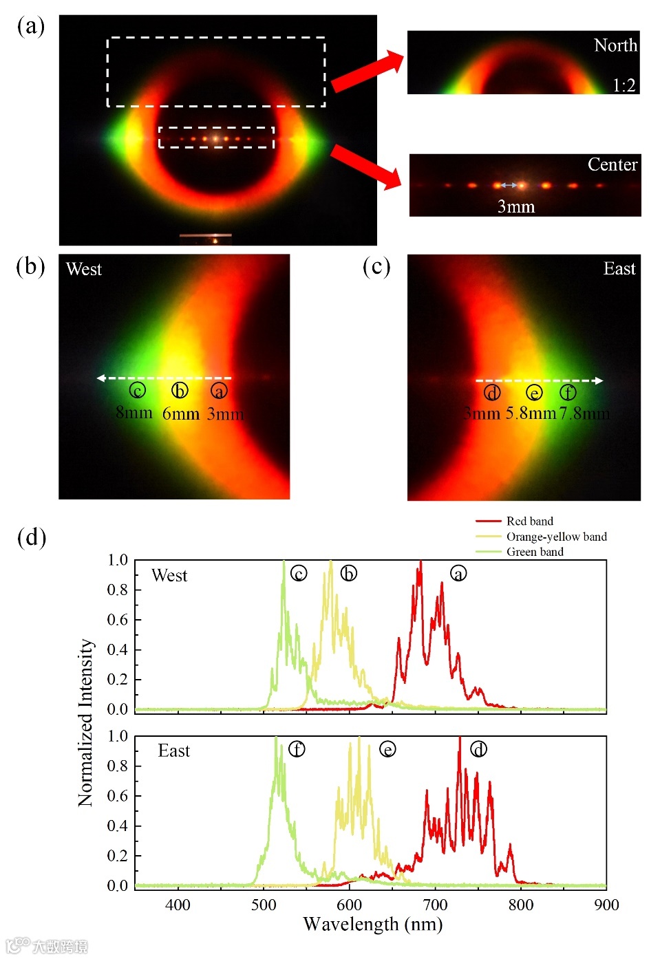 图1. PPLN样品中产生的彩虹切伦科夫辐射实验结果。实验中,飞秒泵浦激光波长为1300 nm,输入功率为60 mW。(a) 多色彩虹切伦科夫二次谐波产生的照片。测量到的整体辐射量与右边放大图之间的比率约为1:2。(b-c) 西、东方向切伦科夫弧的局部放大图像,其中不同颜色的区域分别标记为a, b, c, d, e和f。(d) a, b, c, d, e和f区域的切伦科夫辐射弧的超宽带彩虹光谱。