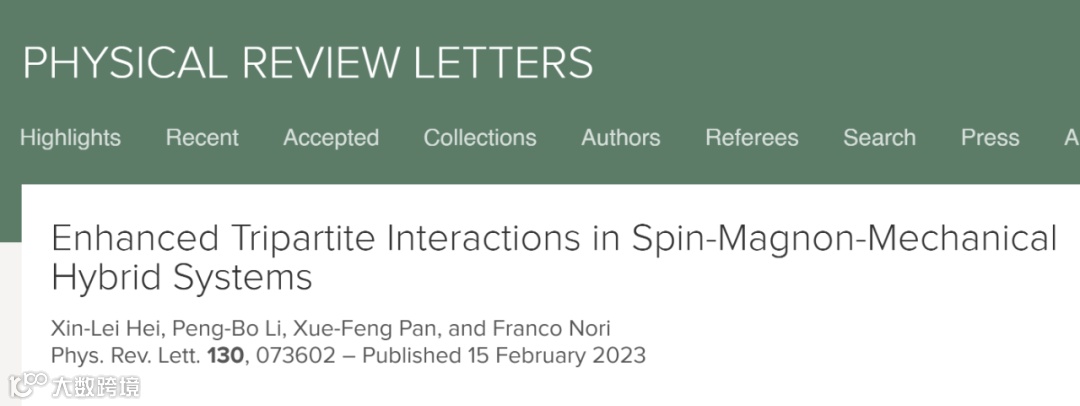西安交通大学物理学院李蓬勃教授课题组在量子三体相互作用和三体纠缠研究方面取得重要进展,提出了实现自旋-磁子-声子三体相互作用的新机制。该成果以「Enhanced Tripartite Interactions in Spin-Magnon-Mechanical Hybrid Systems」为题,2023年2月15日发表在物理顶级期刊《物理评论快报》(Physical Review Letters)上。