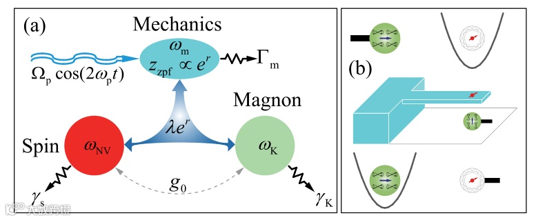 李蓬勃教授课题组与合作者通过开展金刚石NV center电子自旋和磁机械装置的全量子理论研究,发现并提出了一种全新的理论模型——利用自旋和微磁体之间的相对振动,可以实现自旋、磁子和声子之间的直接相互作用。当自旋和微磁体之间存在相对运动时,自旋所感受到的磁振子的磁场会发生变化,从而导致这三个自由度之间在单量子水平上直接相干耦合。为了控制和增强这种三体相互作用,可利用参量驱动增大机械振动模式(声子)的零点涨落,从而实现指数型的自旋-磁子-声子耦合增强。有很多方式可以实现自旋和微磁体之间的相对运动。对于NV center的振动,可以利用保罗势阱或者注入NV center的金刚石悬臂梁振子来实现。对于微磁体的振动,可以利用超导磁势阱中悬浮磁微粒的方式实现。对于参量驱动,以上方案均可利用时变的电驱动调节机械振动的有效劲度系数。