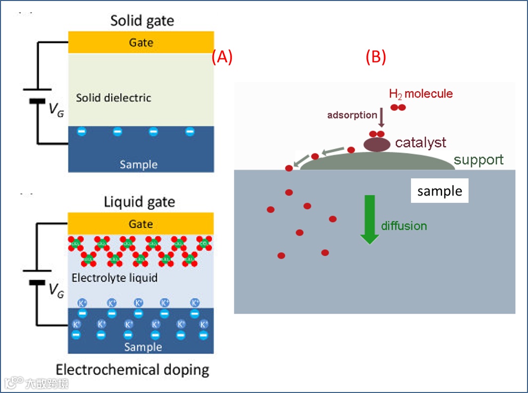 图 2. “离子”自由度介入操控的方法举例:(A) “液态离子门控”技术原理的一个实例展示和 (B) 所谓的“氢溢出法 hydrogen spillover method”植入 H+ 离子 (质子) 原理示意图:一定温度下,H2 被包括 Pd 等在内的贵金属纳米颗粒催化分解,溢出的大量 H 原子扩散进入样品晶格间隙位置,触发化学反应过程。
