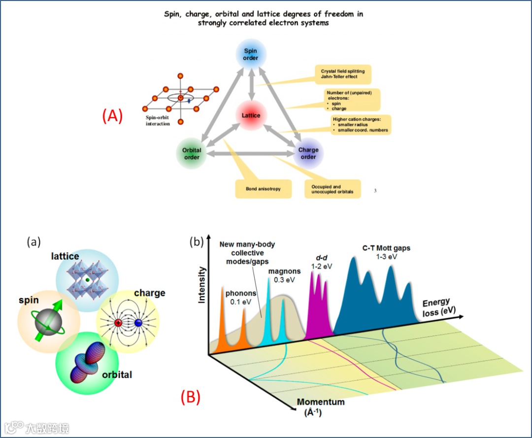 图 1. 作为量子材料领域口头禅的物理自由度、物理效应和对应的能标。一般量子材料所研究的,都是图 1(B) - (b) 中的低能区域,能标在 ~ 1.0 eV 量级。