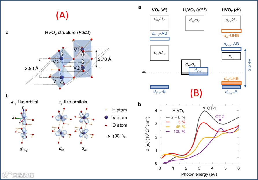 (A) 植入足够质子后所得的 HVO2 结构示意图和 V-3d 电子轨道示意图。体系在室温下呈现正交相 (orthorhombic) 结构,除了很小的质子占位外,结构特征基元与 VO2 高温下的四方 (tetragonal) 金红石相相似。这一结果,意味着植入质子压制低温下的单斜相,应该得到金属态,因为金红石相是金属态。