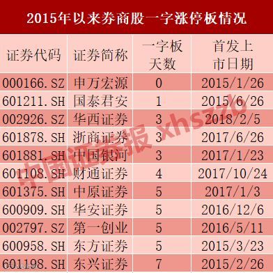 Wind数据显示,2015年上市后的11家券商股中,没有一家的一字涨停板超过7个,其中,申万宏源更是上市首日便开板,今年上市的首只券商股华西证券,一字涨停板天数也仅有3天。据统计,这10 家上市券商连续一字涨停的平均数仅仅为4.1个。