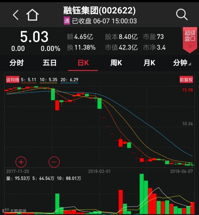 融钰集团股票5月2日复牌后连续跌停。5月15日晚,公司公告与阿里签订合作框架协议,一字跌停板终于打开,但下跌的趋势并没有止住,5月17日起又是3个跌停板。迄今累计跌幅已达60%。融钰集团此前公告称,公司大股东将尽快完成股权转让事宜,以明确并稳定控制权;积极寻找有效、优质资产注入;将积极寻找战略合作方,整合公司有效资源,提升盈利能力,促进公司创新科技业务的转型和提升等。牵手阿里、股权转让、资产注入、大额增持……为了稳定股价,大股东也是拼了。
