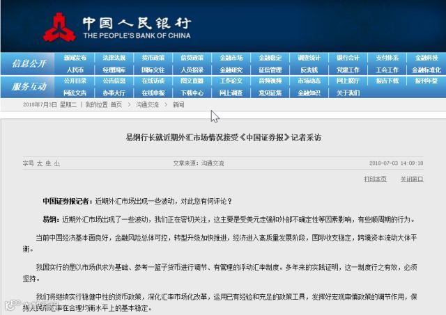 随后,中国人民银行行长易纲就近期外汇市场情况接受《中国证券报》记者采访。