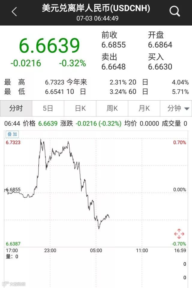 3日早间,离岸人民币兑美元一度跌至6.7323元,较前收盘价大跌近500个基点,并创了2017年8月8日以来的11个月新低。在潘功胜行长上述一席话发表之后,离岸人民币迅速反弹到6.7元附近,午后随着易纲行长接受中国证券报记者独家专访的消息挂网,离岸人民币展开强势反攻,从6.73元一路涨到最高6.65元附近,截至北京时间18:44,最高至6.6541元,较日内低点反弹近800个基点。