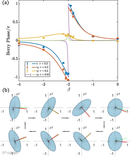 图1. 自旋为1的拓扑量子模拟实验结果。上图:实验观测到的拓扑相变行为,其中 β>-2 对应拓扑荷为2, β<-2 对应拓扑荷为0;不同颜色的数据代表拓扑相变中各种分量的贡献,其中黄色数据代表张量部分的贡献,实线为对应的理论预测结果。下图:实验观测张量椭球在拓扑相变点 β≈-2 附近的几何环绕行为。自旋张量椭球在参数空间中特定回路的演化,可以清晰的反应张量对拓扑荷的贡献。
