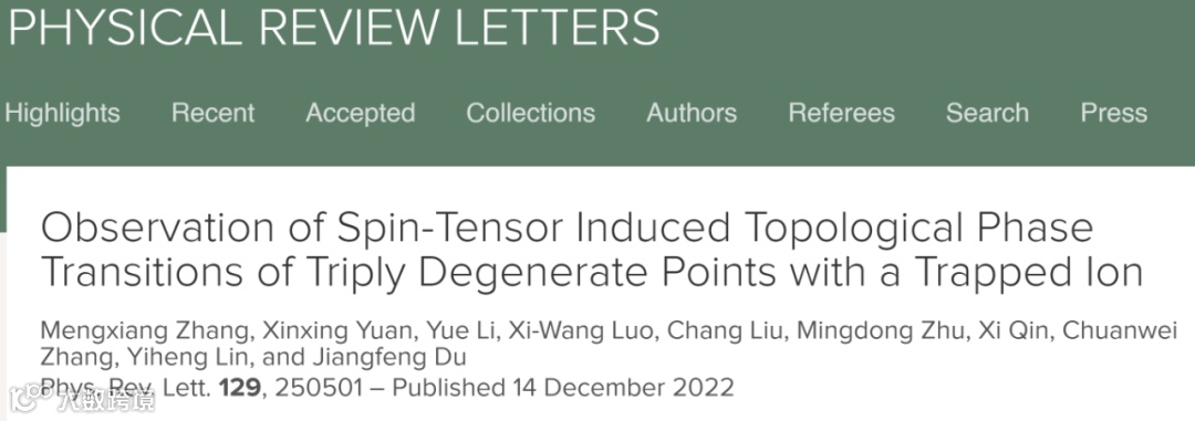 中国科学技术大学中科院微观磁共振重点实验室杜江峰、林毅恒等人与中科院量子信息重点实验室罗希望等合作,在拓扑相变量子模拟方面取得重要进展。通过发展高自旋离子阱体系的调控技术,实现了对三重简并拓扑单极子的量子模拟,观测到具有不同拓扑荷的单极子之间的相变,并展示了自旋张量在其中的重要作用。该研究结果于2022年12月14日以「Observation of Spin-Tensor Induced Topological Phase Transitions of Triply Degenerate Points with a Trapped Ion」为题,发表在《物理评论快报》上[Phys. Rev. Lett. 129, 250501 (2022)] 。中科院微观磁共振重点实验室博士研究生张梦翔、李岳以及袁新星博士为该论文共同第一作者,杜江峰院士、林毅恒教授和罗希望教授为共同通讯作者。