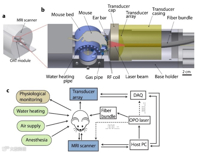 瑞士苏黎世大学医学院的Daniel Razansky等人提出了一个用于小动物研究的混合磁共振和光声断层成像(MROT)系统。光声断层系统被设计成一个模块,可以插入到高场的磁共振扫描仪中(图1a),它集成了一个定制的与核磁共振成像兼容的换能器阵列、一个照明模块和一个专用的射频线圈。研究人员开发了一个定制的光声断层成像数据处理管道,以减少来自核磁共振成像的干扰,并提出了一个图像处理管道,以促进两种模式之间的数据核心化。随后,他们展示了用扫描仪同时采集双模式解剖学和血管学的大脑图像,以及对受氧合压力的动物进行多种血液动力学参数的实时功能读取。