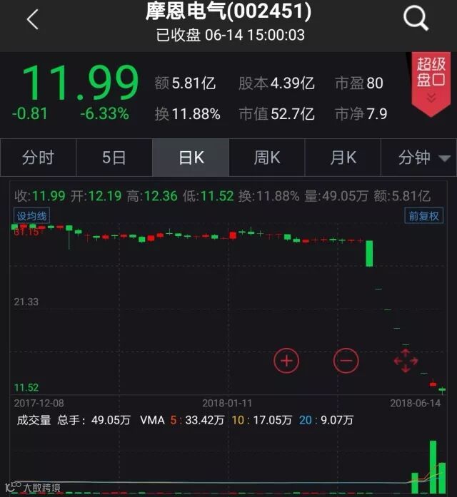 摩恩电气公司主营业务包括电线电缆、风电塔筒和租赁保理,并且公司开始发展不良资产处置服务业务,已逐步成长为业绩贡献主要力量。业绩方面看,2017年,摩恩电气实现净利润5922.62万元,同比增580.57%。2018年一季度,公司实现净利润1168.02万元,同比增147.58%。今年2月22日,摩恩电气宣布筹划重大资产重组事项并停牌,将以现金购买开开电缆科技有限公司,重组标的是国内具有一定规模的常规及特种电线电缆生产基地之一,不过本次重组事项却因各种原因未能在原计划时间内完成。此番并购本是稳定公司主营业务,提振股价之举,然后却演变成股价噩梦。6月5日公司复牌后,连续跌停,股价腰斩。二股东融屏信息的高比例股份质押违约被平仓更是让股价雪上加霜。
