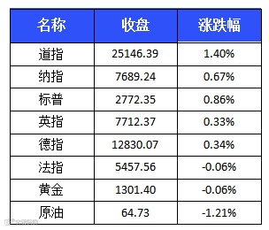 国际贸易关系解冻迹象令市场得到提振,周三美三大股指齐涨。道指攀升346.41点,重新站上25000点关口,纳指连续三日创下历史新高。标普500指数收涨23.55点,涨幅0.86%,报2772.35点。道琼斯工业平均指数收涨346.41点,涨幅1.40%,收于100日均线上方,报25146.39点。纳斯达克综合指数收涨51.38点,涨幅0.67%,报7689.24点。