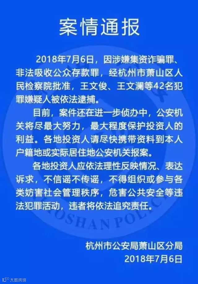 7月6日,杭州市公安局萧山区分局发布微博:因涉嫌集资诈骗罪、非法吸收公众存款罪,王文俊、王文澜等42名犯罪嫌疑人被依法逮捕。