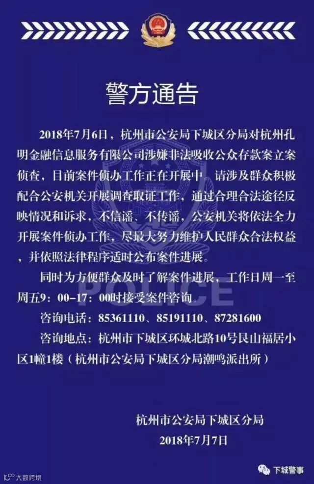 当日,杭州市公安局下城分局对孔明金融涉嫌非法吸取公众存款案立案侦查。