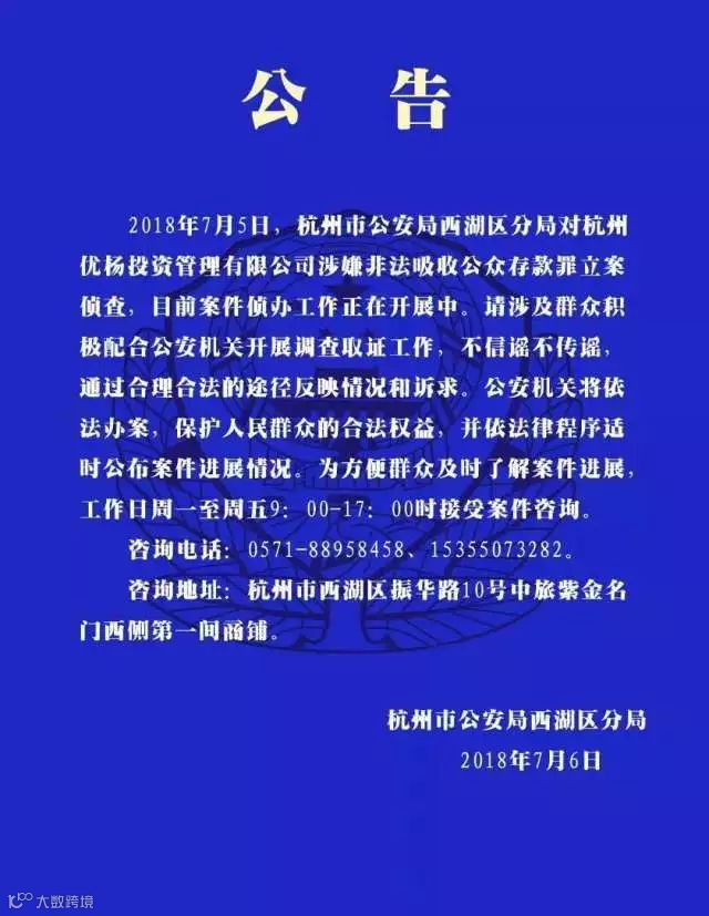 7月6日,杭州市公安局西湖区分局发布微博:对杭州优杨投资非法吸取公众存款罪立案侦查。平台累计交易额34.6亿元,用户98万人。