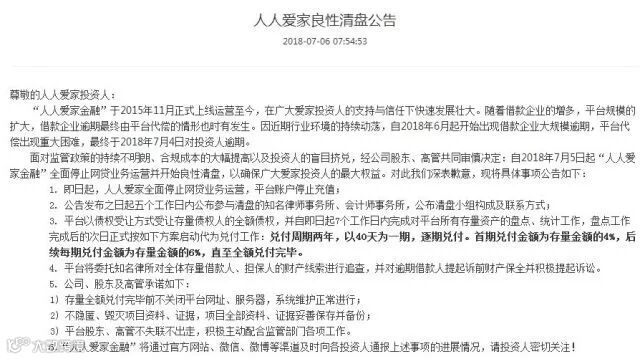 7月6日,杭州孔明金融信息服务有限公司旗下百亿级P2P平台人人爱家金融官网发布公告显示,自2018年6月起开始出现借款企业大规模逾期,平台代偿出现重大困难,自2018年7月5日起开始清盘。平台累计投资总额232亿元,累计注册用户超过173.6万人。