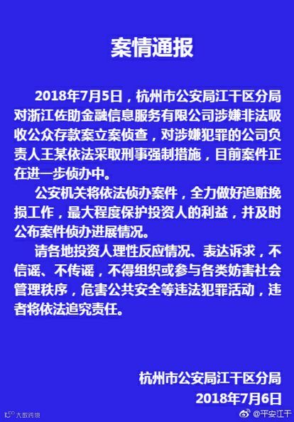 7月5日,杭州市公安局江干分局对佐助金服涉嫌非法吸取公众存款案立案侦查。公司创始人兼CEO王旭航被采取强制措施。