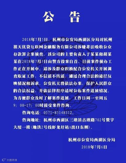 7月6日,杭州市公安局西湖区分局发布微博:对杭州祺天优贷非法吸取公众存款罪立案侦查。平台累计成交金额68亿元。公司负责人已向警方投案自首。