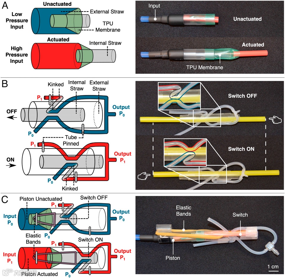 随着软体机器人领域的发展,器件变得越来越复杂。柔性和半柔性气动机器人现在可以执行具有挑战性的动作(如打电子游戏,弹钢琴等)。软器件的进步带来了更有效的医疗护理(如手部康复,微创内窥镜手术等),另外,其他的发展包括越来越普遍的物体操作能力,以及人类和机器人之间更紧密的联系。然而,许多软器件控制系统仍然依赖于硬阀门和电气控制组件。将控制系统集成到软器件中是实现复杂器件和复杂驱动序列的必要步骤,同时保持软材料提供的优势。早期的流体逻辑,主要是通过微流体芯片实现的。然而,对于软体机器人的大多数应用,缓慢的流速限制了执行器的小尺度力。此外,虽然修改基本系统架构可能使高效逻辑类似于互补金属氧化物半导体(CMOS)类型的系统,但大多数微流体系统在稳态时由于下拉电阻而损失能量,类似于早期的晶体管-晶体管电子逻辑系统。近些年来,开发的多种软阀试图解决微流体的规模和流量限制。此外,研究人员还试图利用多材料3D打印技术来克服微流体振动阀和宏观弹性软阀的局限性,但早期流体逻辑系统的许多局限性仍然存在。