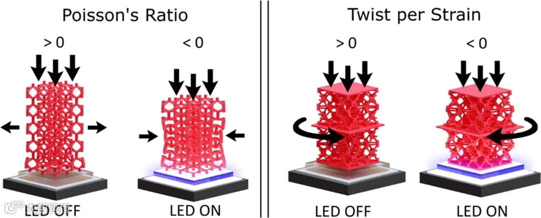 超构材料的有效性能主要来源于其设计的微观结构,而不是其组成材料。因此,如果能够通过施加外部刺激显著改变微观结构,就能够改变有效的超构材料特性。例如,超构材料可以在阳光照射下改变其力学性能,以自动调整照明条件,改变其外观,或控制室温。刺激反应性超构材料可以作为生物细胞的可调节拉伸台。另一个例子是,弹性波的传播和偏振可以由光局部控制,甚至在时空超构材料的意义上也是如此。以前的实验是沿着这些思路进行的,使用温度、压力、溶剂、电压、静态磁场或光作为刺激。然而,这些实验仅限于宏观模型、有效的2D结构,或材料参数调节范围有限,尤其不包括光翻转材料参数符号的极端可能性。