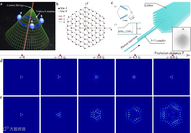 (a) 狄拉克费米子在宇宙弦附近演化示意图;(b) 映射出变形石墨烯的二维点阵;(c) 飞秒激光直写的波导阵列;(d) 轨道角动量的光子在模拟宇宙弦的光子点阵中传播;(e) 无轨道角动量的光子在模拟宇宙弦的光子点阵中传播。