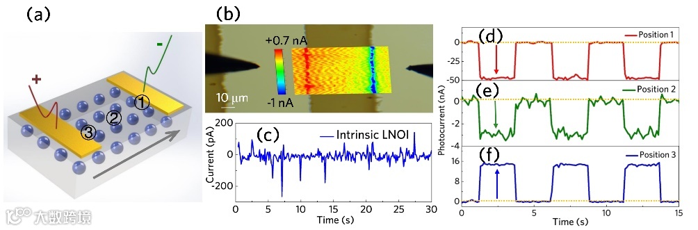 图1.(a) LNOI光电探测器示意图;(b)光电流面扫图;(c)本征LNOI(未离子注入改性)的I-T曲线;图1(a)标记的(d)位置1,(e)位置2,(f)位置3处,I-T曲线。