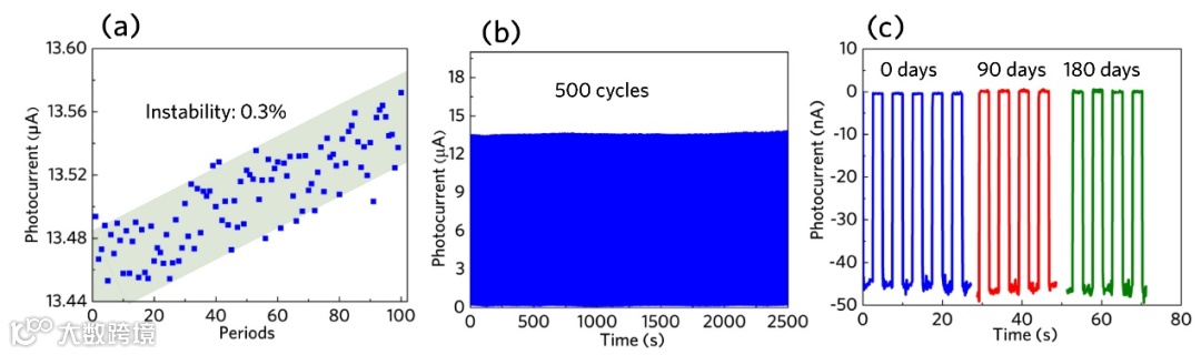 图2.(a)30V偏压下,100个周期内光电流的变化;(b)30V偏压时的I-T曲线;(c)铌酸锂薄膜在空气中放置180天后的光电流变化。