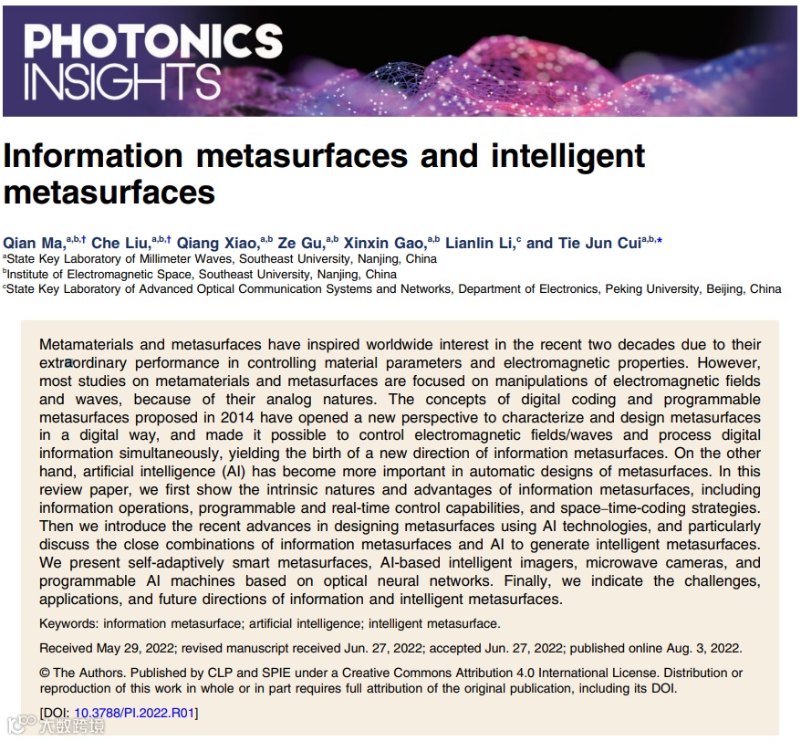 应Photonics Insights创刊主编邀请,东南大学崔铁军院士团队撰写了题为“信息超表面与智能超表面”的综述论文并发表于Photonics Insights 2022年第1期。