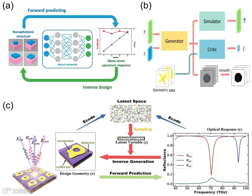 (a) 反演光谱响应与元原子结构之间关系的可逆神经网络示意图;(b) 具有任意图案的二维超表面单元逆向设计的GAN流程图;(c) 具有潜在空间的逆向设计GAN的示意图