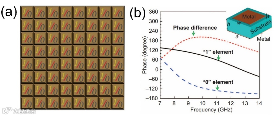 (a) 1比特数字编码超材料;(b)具有“0º”和“180º”相位响应的超表面单元
