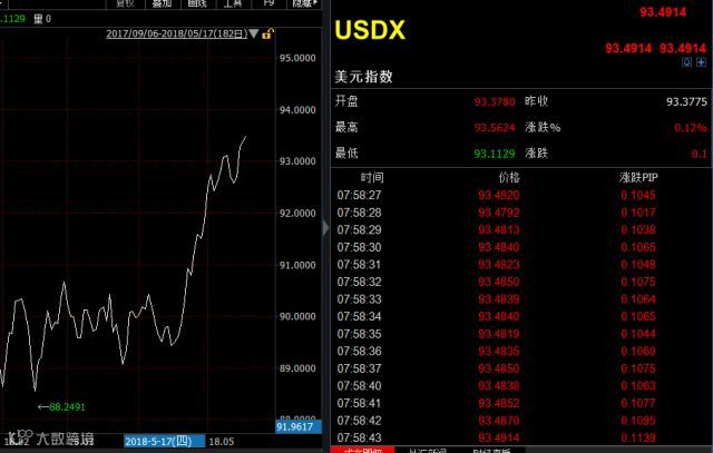 接着是外汇市场:美元大幅走高,从2月份88点低位反弹至93.48点一线,创年内新高。