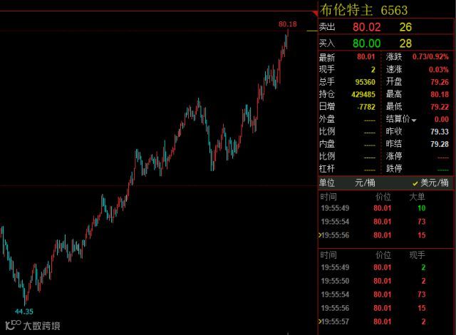 5月17日截至中国证券报记者发稿时,Brent原油盘中最高上探至80.18美元/桶,为2014年11月底以来首次击破80美元/桶。WTI原油则最高上探至72.3美元/桶。