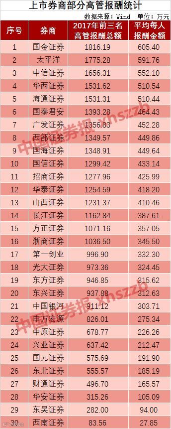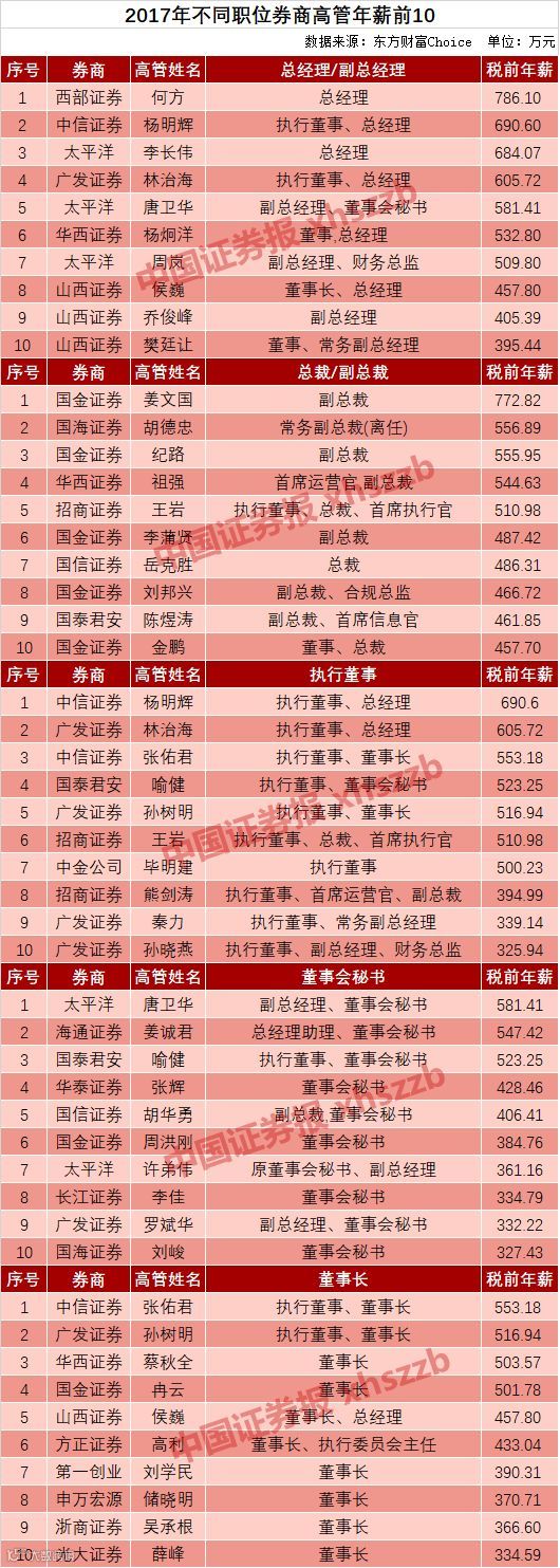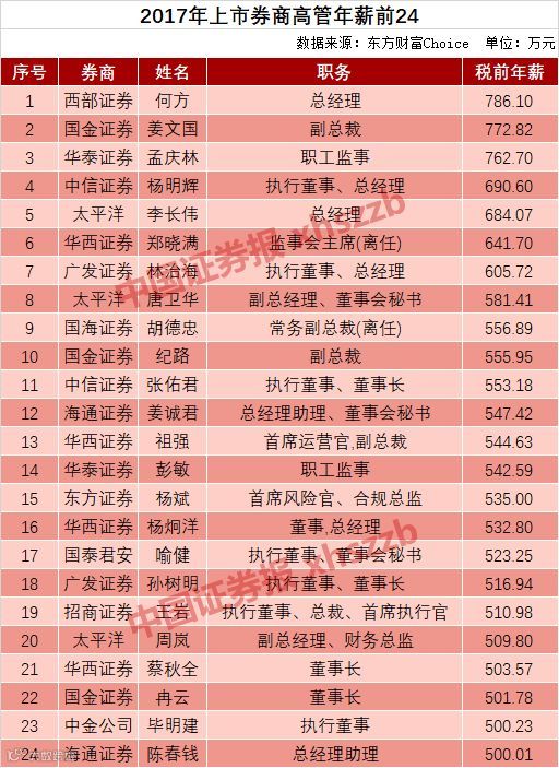 其中,西部证券总经理何方以786.10万元的税前年薪,成为2017年券商最高年薪获得者;国金证券副总裁姜文国排名第二,税前年薪为772.82万元;第三名则是华泰证券经纪业务总部总经理孟庆林,税前年薪为762.7万元。