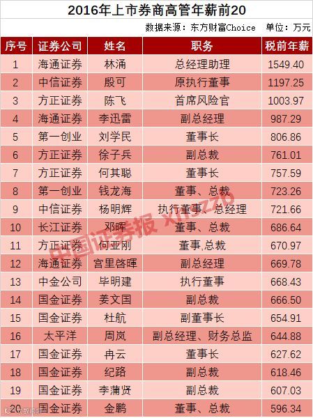 东方财富Choice数据显示,2016年券商高管年薪前三甲均超过了1000万元,其中,海通证券总经理助理林涌以1549.40万元轻松夺冠,足足领先第二位352.15万元;其次是中信证券原执行董事殷可当年年薪1197.25元;以及方正证券首席风险官陈飞1003.97万元。