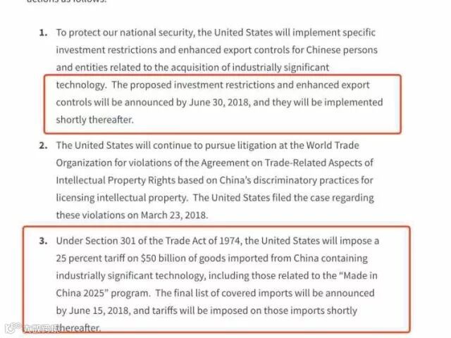 声明还称,根据《1974年贸易法》第301条,美国将针对总值500亿美元含有重要工业技术价值的中国产品征收25%的关税,包含那些与“中国制造2025”相关的产品。最终的进口商品清单将于2018年6月15日之前公布,稍后将对这些进口产品征收关税。