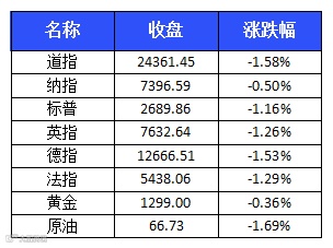 受意大利与西班牙等欧洲国家政局影响,美股周二低开,白宫宣布对500亿美元含有“重要工业技术”的中国进口商品加征25%的关税后,美股跌幅扩大,道指一度下跌超过500点。截至收盘,标普500指数收跌31.47点,跌幅1.16%,创4月24日以来最大单日跌幅,报2689.86点;道琼斯工业平均指数收跌391.64点,跌幅1.58%,也创4月24日以来最大单日跌幅,报24361.45点;纳斯达克综合指数收跌37.26点,跌幅0.50%,报7396.59点。