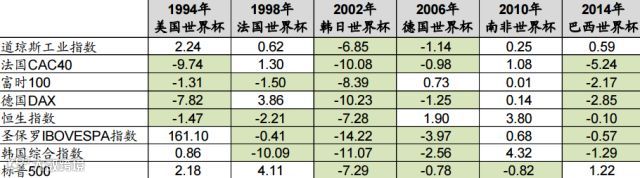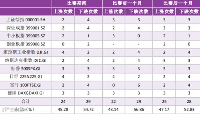 联讯证券分析师梳理了全球10个主要股指发现,近6次世界杯中,比赛期间45.28%上涨,54.72%下跌;比赛前一个月 43.14%上涨,56.86%下跌;比赛后一个月 47.17%上涨,52.83%下跌,总之是跌多涨少。