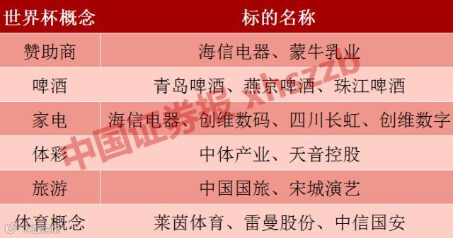 财通证券则表示,随着中国企业与国际足联合作的加深,相关赞助商们或从世界杯获益。2018年俄罗斯世界杯共有7个国际足联顶级赞助商,包括5个世界杯官方赞助商和3个地区合作伙伴。其中,中国企业有4个,分别是1个国际足联顶级赞助商万达,3个全球官方赞助商——海信、蒙牛和vivo,1个亚洲地区合作伙伴雅迪。
