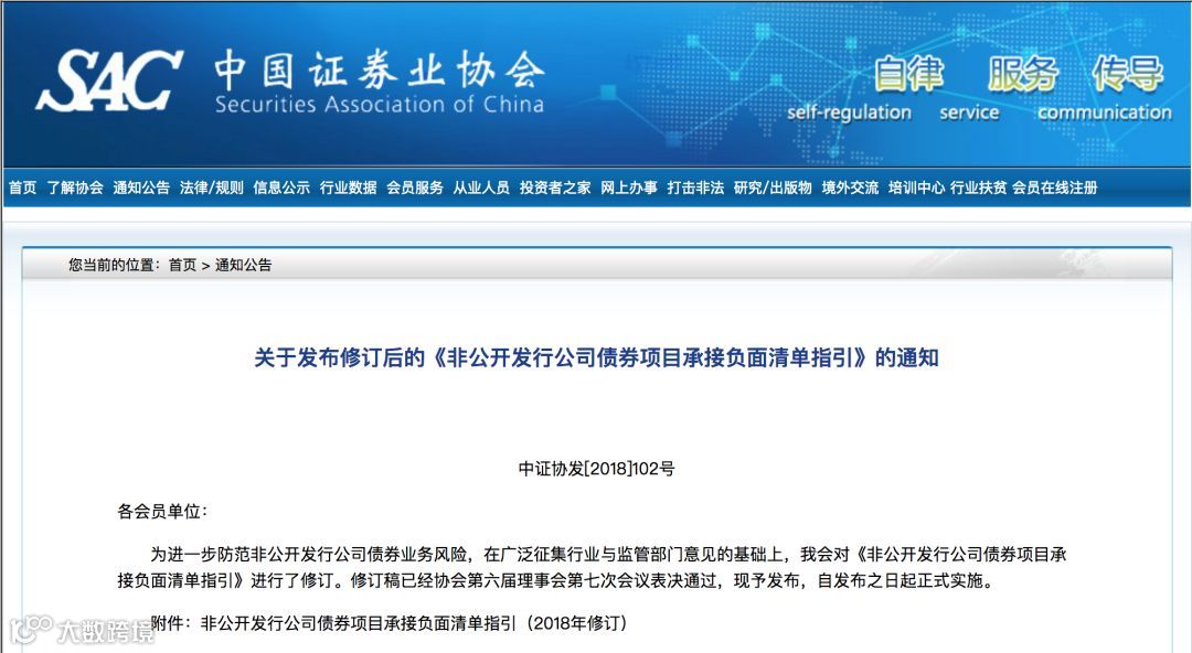 2018年5月11日下午,中国证券业协会在其官网发布了修订后的《非公开发行公司债券项目承接负面清单指引》(下称《负面清单指引》),自发布之日起正式实施。